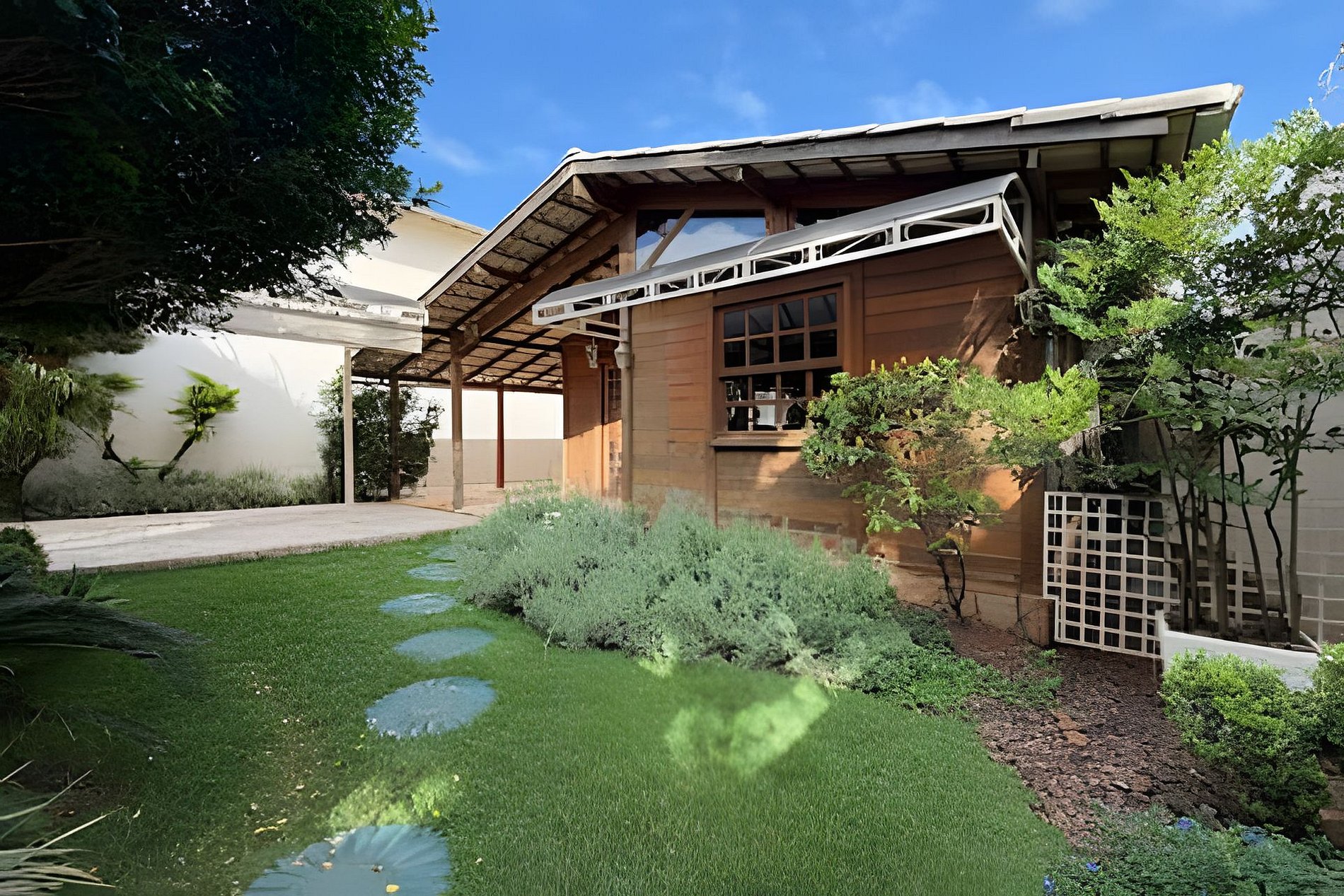 Ao redor da casa, o verde das plantas e o delicado perfume das lavandas tornam o ambiente ainda mais agradável. A iluminação suave contribui para criar uma atmosfera tranquila e relaxante.